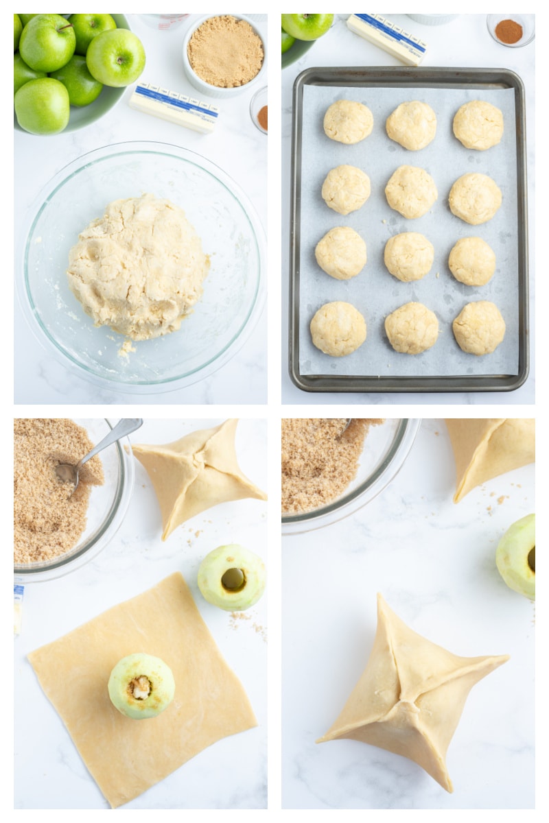 - On a floured-surface, roll each portion of dough into a 7-inch square. Place an apple on each square. Combine the sugar and cinnamon; place tablespoonful into the core of each apple. Dot each with 1 teaspoon of butter.