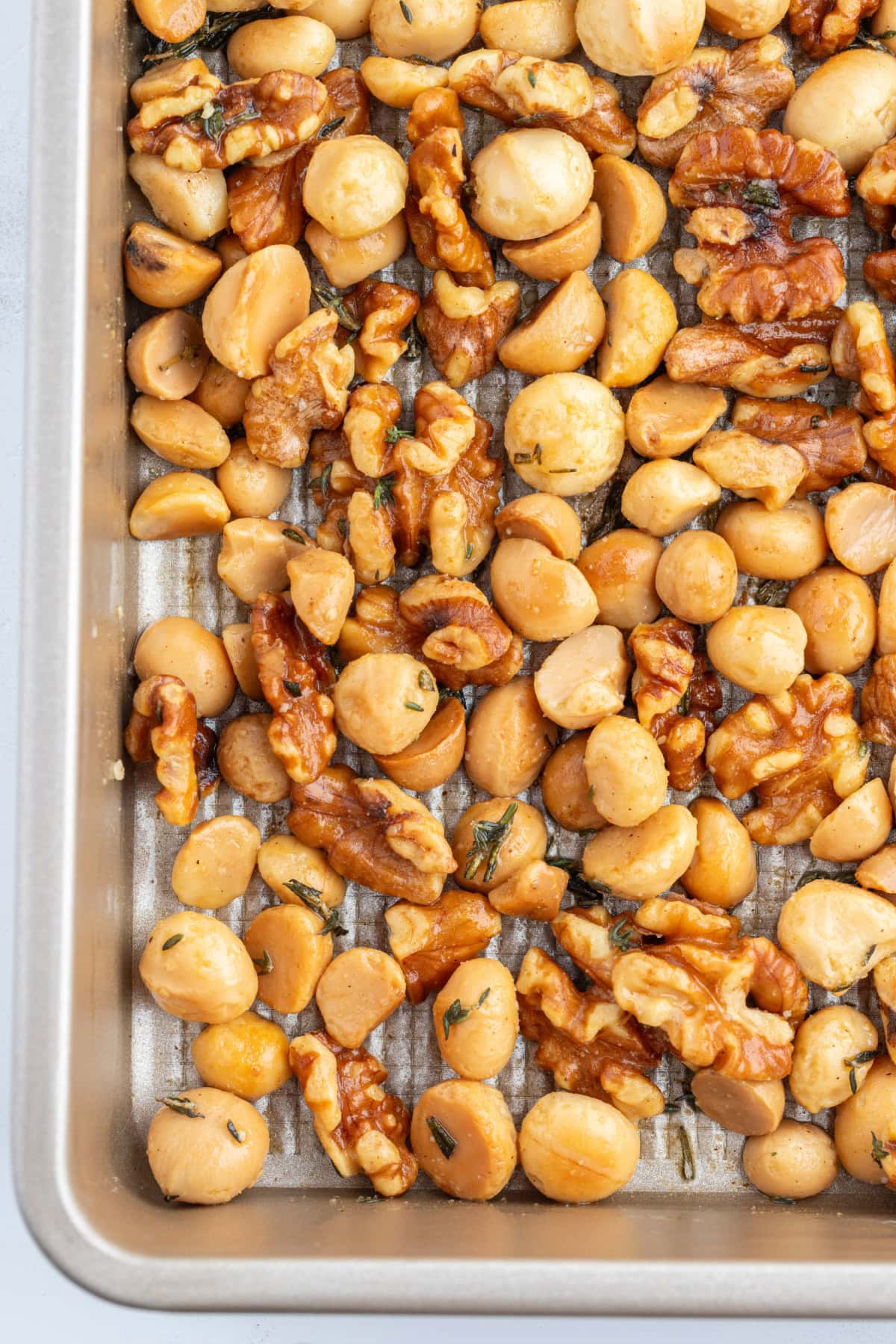The great thing about this recipe for savory nuts is that you can use any nuts that you want (or the nuts that are on sale!) Use any mix of almonds, cashews, pecans, walnuts… whatever you like best.