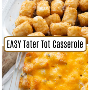 Easy Tater Tot Casserole is the ultimate comfort food dinner. It has a creamy, ground beef sauce and it’s topped with plenty of melted cheese.